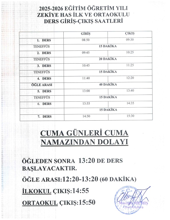 2025-2026 EĞİTİM ÖĞRETİM YILI GİRİŞ ÇIKIŞ SAATLERİ